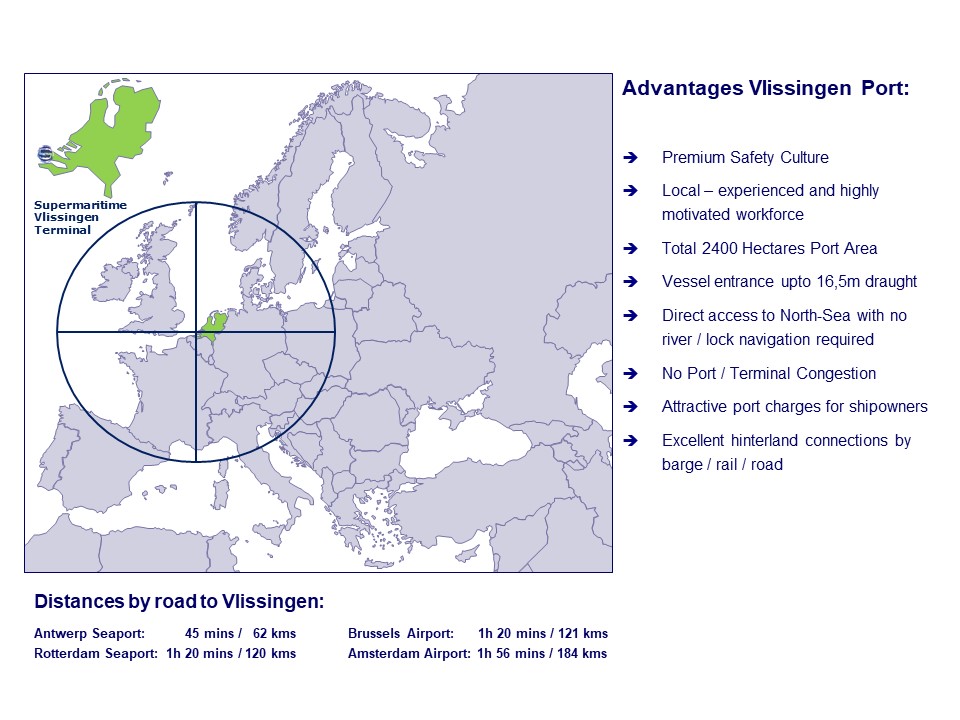 With effect of April 1st 2013 Supermaritime Nederland moved to a newly built 83.000 sqm terminal, with its own – dedicated – deep-water quayside in the Scaldia basin of Vlissingen port.